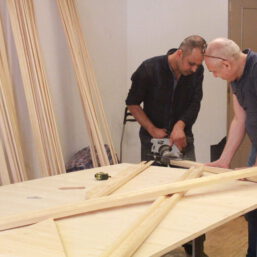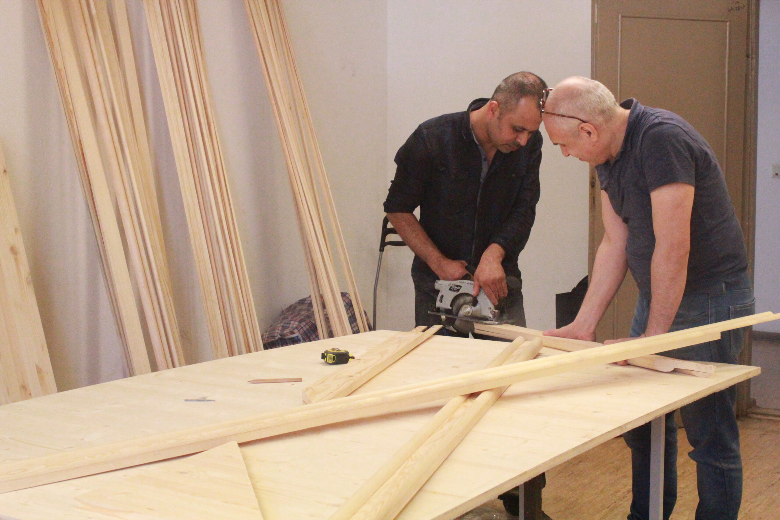 Gemeinsam mit den professionellen Künstler*innen und Tischler*innen Nidal Jalouk, Fatima Abdo, Raed Alhameed, Mohammad Rabee Alskif, Kifan Alkarjousli, Musa Farejah, Walid Fraije, Oula Soleman und Anastasia Usatowa wurden unter der Leitung von Nahed Mansour mit den Bewohner*innen des Refugiums sowie den ARRIVO BERLIN Übungswerkstätten Ausstellungs- und Vermittlungsräume mit besonderen Vitrinen-Displays entworfen und gestaltet.